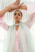 This ultra-flowy two-toned creation is perfect for spring festivities, boasting a stunning ombre color. The elegant silk long shirt features a beautiful neckline adorned with exquisite 3D embroideries, pearls, and sequins for a summer glow. The ensemble gracefully transitions from pink to mint, embellished with floral cutwork motifs and trendy sleeves. Paired with silk long pants and a two-toned embellished dupatta, this look exudes elegance and sophistication, ideal for any special occasion.