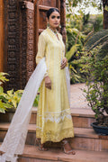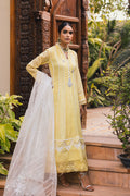 A luxurious ensemble that exudes elegance. The blooming yellow self printed khaadi net shirt features a delicate hand-embroidered paisley and floral design, while the intricate work the neck and hemline detailing that adds a touch of sophistication to the outfit.