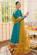 An exquisite sea green self khadi net angrakha, gracefully embellished with intricate resham embroidery and hand-crafted details of dabka, sequins, and cut dana. This piece radiates refined elegance. Paired with a striking mustard jamawar dhaka pajama, it creates a chic and stylish contrast that demands attention. Completed with a contrasting mustard French net dupatta, adding a layer of opulence to the look.