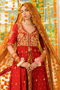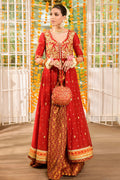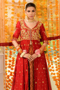 The "Saboor" ensemble is the epitome of timeless elegance, featuring a mesmerizing silhouette highlighted by vibrant hues and intricate details. Made from pure red raw khadi net, the kalidaar showcases exquisite threadwork in rich rust and maroon tones. Delicately hand-embroidered motifs grace the front and back, adding a touch of traditional allure. The look is completed with a stunning rust dupatta, meticulously embellished and hand-embroidered.