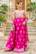 The multi-colored screen-printed silk choli, embellished with intricate kura, dabka and zardozi details, exudes an enchanting charm. Paired with a stunning fuchsia silk lehenga, adorned with scattered chunky block-printed motifs, it makes a striking contrast. Completing the ensemble is a delicately crafted net dupatta, with a screen-printed finish that adds to the overall elegance.