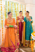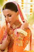 Radiate regal elegance in this exquisite burnt orange and gold peshwas. The bodice, adorned with intricate floral and celestial embellishments, perfectly fuses tradition with glamour. The sleeves feature a delicate gold handwork trim while the shimmering chatapati border elevates its luxurious charm. Paired with a chan dupatta, finished with a refined gold border, this outfit is a true masterpiece, ideal for making a royal statement.