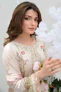 This gorgeous articles features a sericel digital printed ivory long shirt with delicate floral motifs. The neckline is fully embroidered and embellished, adding a rich, detailed finish to the look. The daman and sleeves are adorned with intricate lace and raw edge border detailing. The outfit is paired with ivory culottes featuring lace inserts and pleated accents. A similarly printed medium silk dupatta with elegant tassels completes the ensemble