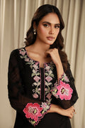 This article features a black Khaadi net straight shirt which is machine embroidered with contrasting colors and embellished with laces, sequins, pearls, and pin-tucks finished with machine-embroidered pants and a Khaadi net dupatta.
