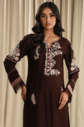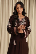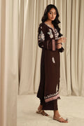 This eclectic article features a dark brown khaadi net shirt with pastel embroidery and silver embellishments with raw edge details and beautiful cotton silk wide-legged trousers finished with a block-printed dupatta.