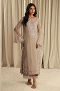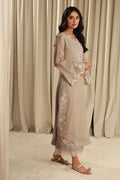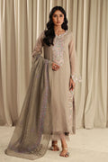 This article features a pale grey khaadi shirt which is embroidered and embellished with pastel colors pearls and sequins kora and organza raw edges finished with a slitted cut work sleeve, and cotton silk pants with pleated accents and a khaadi net block-printed dupatta.