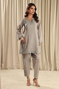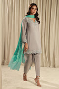 This beautiful short grey mirror silk a-line shirt with Tiffany green colored embroidery and embellishment finished with simple cotton-silk pants and Tiffany blue colored dupatta.