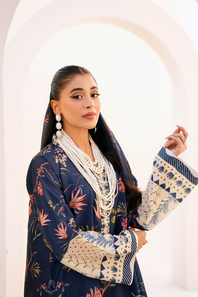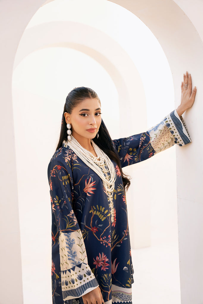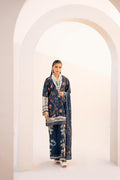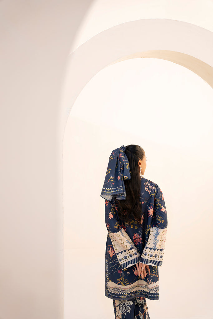A midnight blue with a delicate floral pattern. This printed silk short shirt master piece is a gorgeous addition to your wardrobe. The set comes with a complimentary scarf.