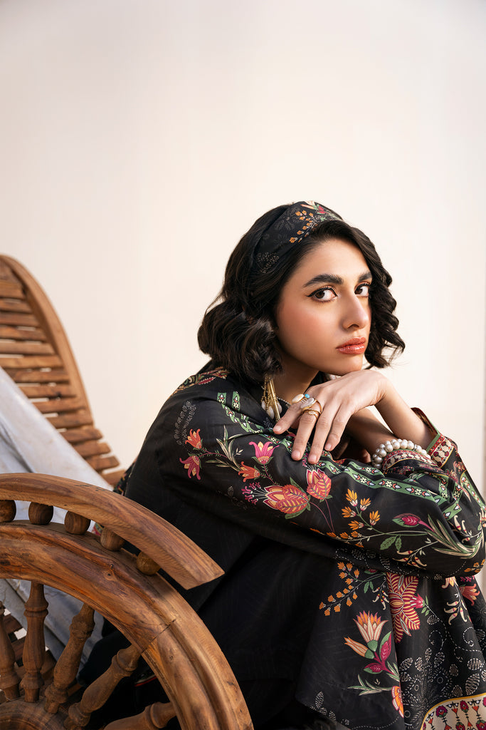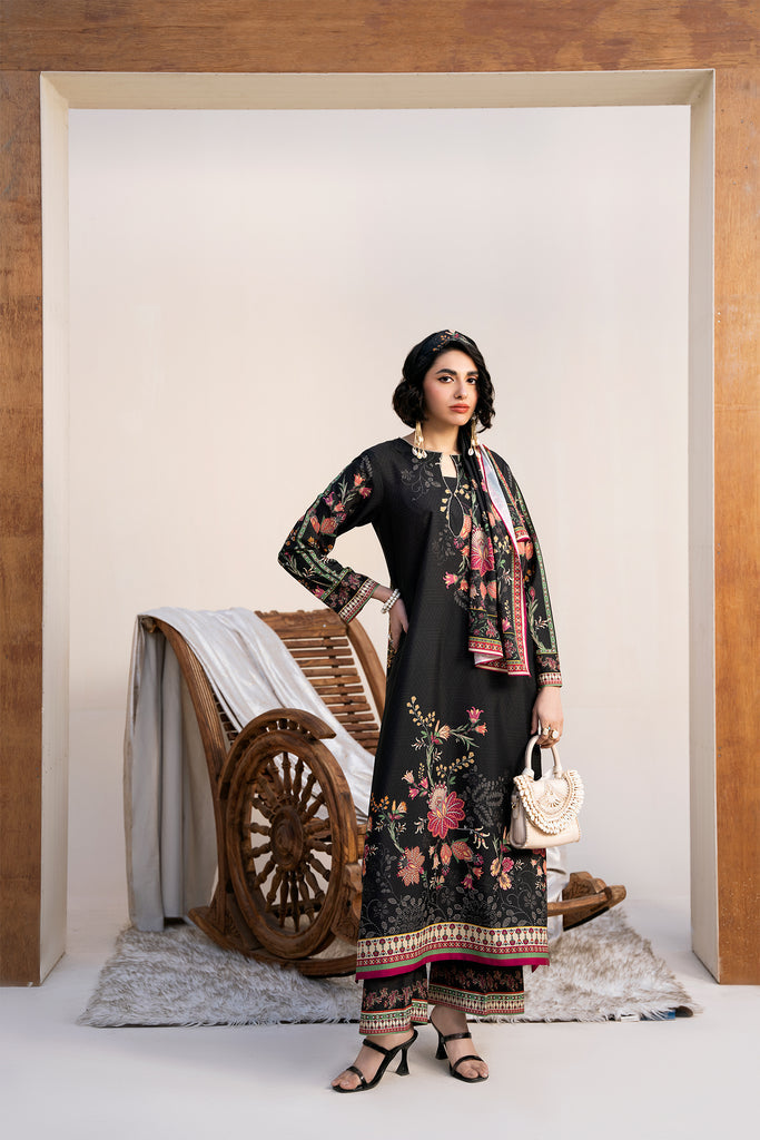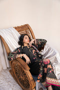 A gorgeous work of art, this black with bold hues printed silk set is a must have and comes with a complimentary scarf to add that bit of sophistication.