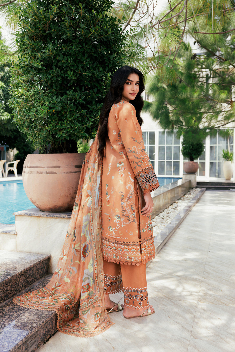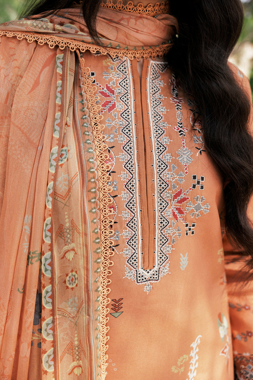 Digital Printed Embroidered Viscose Front 1.25 Mtr Digital Printed Viscose Back and Sleeves 1.85 Mtr Digital Printed Chiffon Dupatta 2.5 Mtr Dyed Viscose Trouser 2.5 Mtr Embroidered Border for Sleeves 1 Yard Embroidered Border for Trouser 1 Mtr.