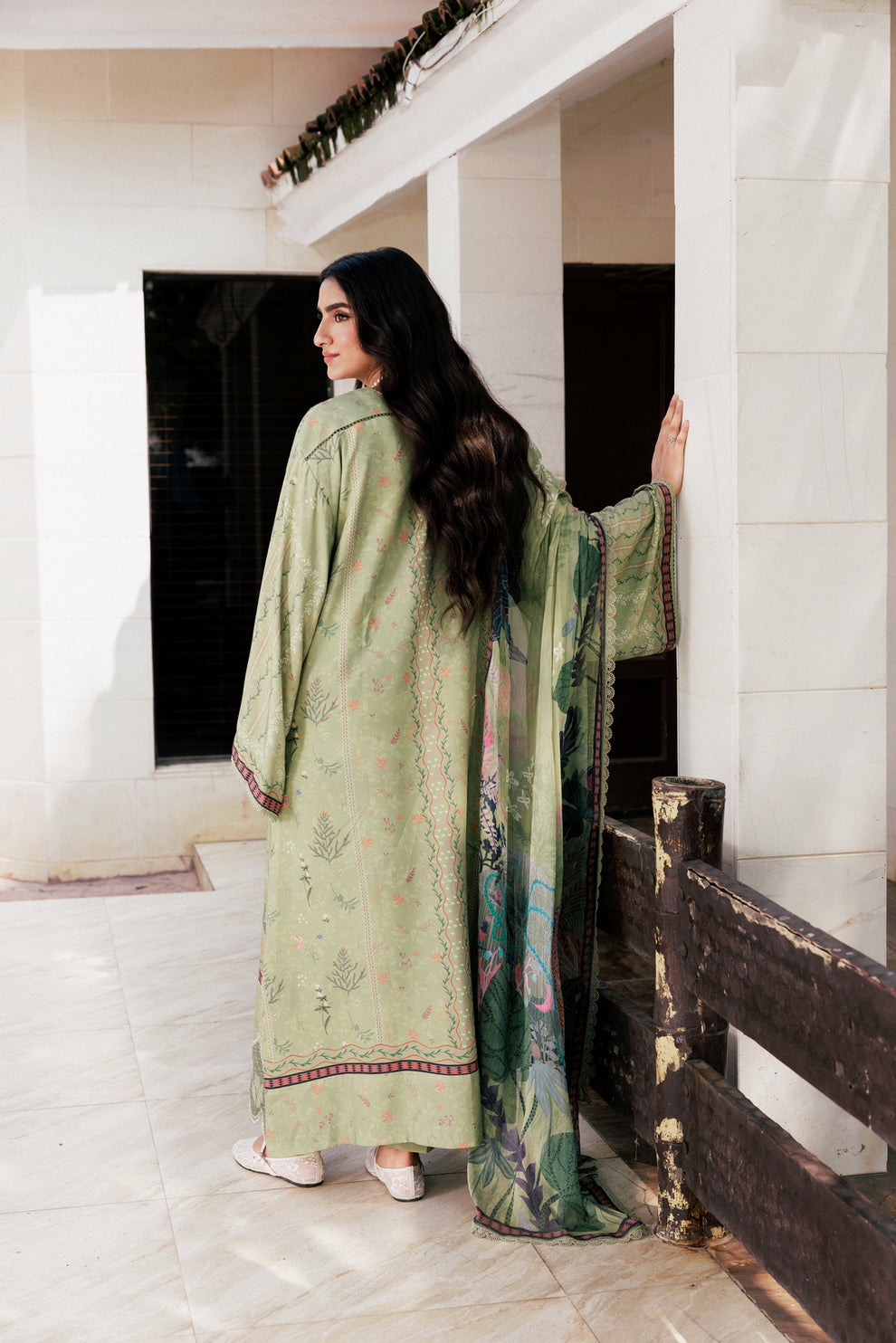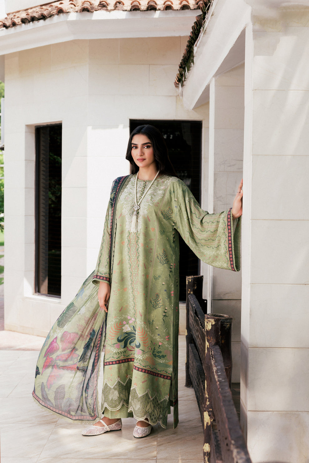Digital Printed Embroidered Viscose Front 1.25 Mtr Digital Printed Viscose Back and Sleeves 1.85 Mtr Digital Printed Chiffon Dupatta 2.5 Mtr Digital Printed Viscose Trouser 2.5 Mtr Embroidered Border for Sleeves 1 Yard.