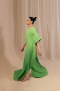 This green ombre kaftan offers a serene blend of shades, creating a soft, natural flow. The neckline features elegant embellishments, adding just the right amount of detail to elevate the look. With its fluid drape and refined accents, this kaftan brings an easy elegance to any occasion.