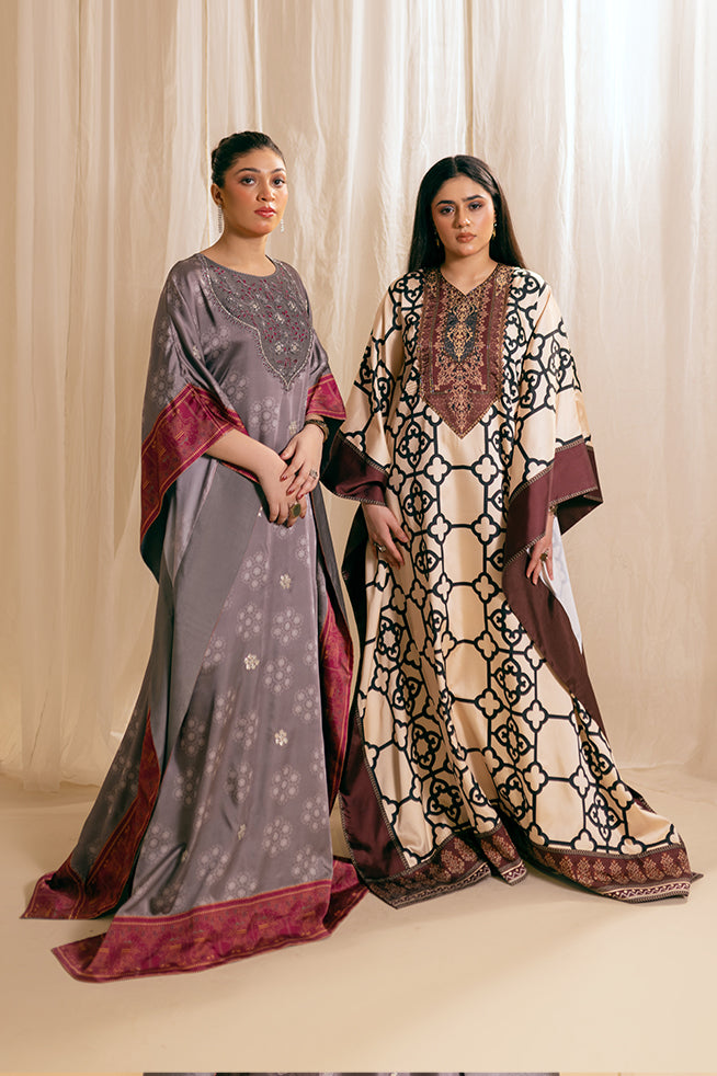 In soft grey, this kaftan showcases a timeless printed chunri design, enhanced by delicate gota work for a touch of traditional flair. The embroidered neckline is further elevated with embellishments, creating a subtle yet captivating detail. Flowing beautifully, this piece blends cultural charm with effortless style.