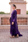 Presenting 'Manal', a captivating purple ensemble. The shirt is adorned with detailed neckline with embroidery and hand embellishment, with delicate stone spray with embroidered motifs across the shirt. The tailored design features 3D net floral lace on the hem, adding a touch of sophistication. Paired with classic azaar pants and a dupatta enhanced with stone spray and an embroidered organza pallu.