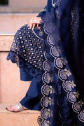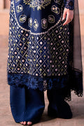 Introducing 'Rukhsana', a navy blue ensemble that exudes charm and sophistication. The shirt dazzles with vibrant embroidery motifs and panels of coloured organza, adorned with delicate floral lace. The neckline, embellished with lace, glimmers with crystal and pearl accents, while the sleeves feature intricate motifs. Paired with an organza-bordered dupatta and classic straight pants.