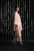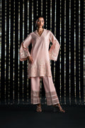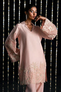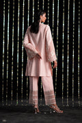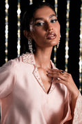 The Nude Pink outfit features a collar adorned with elegant embellishments of sequins and crystals. The hem showcases intricate, nature-inspired embroidery, highlighted by shimmering sequins and crystals. The sleeves are similarly embellished, creating a cohesive and sophisticated design. Completing the look, the Azar pants are elegantly finished with a sequined embroidered border.