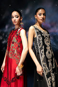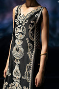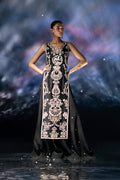 Crafted in rich black silk tissue, this shirt boasts a regal straight silhouette from shoulder to floor, with side gussets adorned with elaborate pattern embroidery. The shirt is lavishly embellished with detailed embroidery work and paired with delicate plazo pants, that are adorned with a subtle sequins spray.