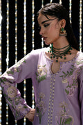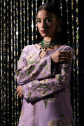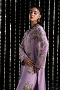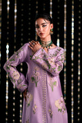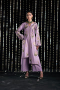 The lilac cotton net shirt is adorned with embroidered floral bunches, intricately embellished for a touch of refined elegance. The neckline to hemline features a carefully adorned placket, and the straight sleeves continue the theme with matching embroidery and embellishments. This ensemble is completed with Azar pants.