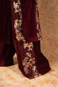 This exquisite maroon formal dress features a panneled shirt adorned with intricate embroidery that brings attention. The embroidered narrow sleeves, detailed with buttons and tassels, add charm to the design. Paired with culottes showcasing embroidered panels on the sides, this ensemble offers a beautiful silhouette for any formal occasion.