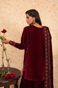 This luxurious maroon velvet pair showcases stunning cross-stitch embroidery, beautifully complemented by tilla detailing on the neckline, sleeves, and sides. Full-length narrow sleeves feature embroidered cuffs, while tassel accents on the neckline and sides add a charming touch. Paired with a matching shalwar, this ensemble offers a refined and minimalistic elegance that speaks for itself.Â