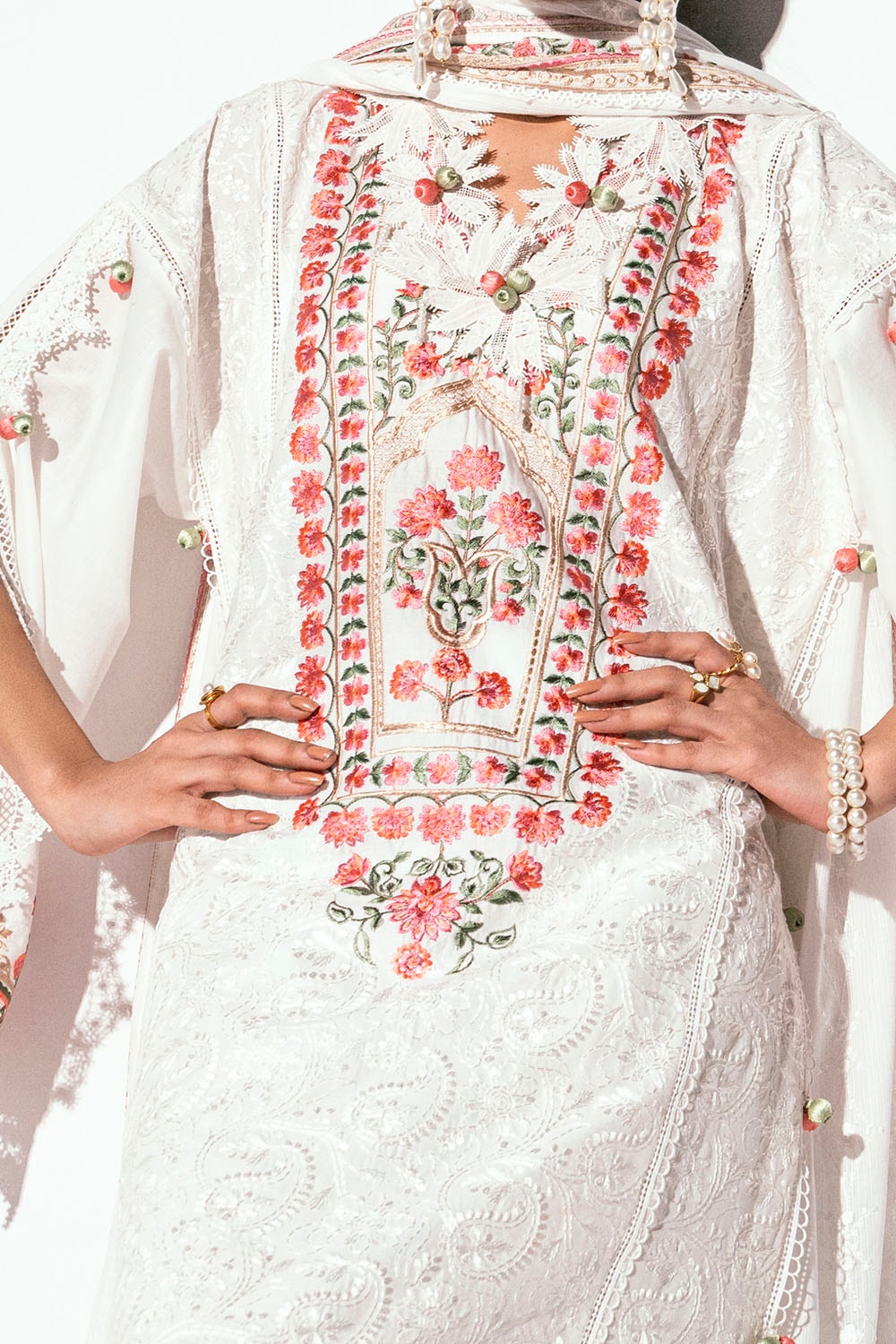 Embroidered Lawn Shirt Front & Sleeves with Embroidered Borders for Front & Back. Embroidered Borders & Bunches for Sleeves on Organza. Dyed Lawn Back - 2.28 Meters