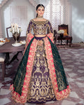 Kehkshan - exudes the spirit of festivity. The pop of colours, the use of different fabrics, the sheer intricacy of the embroidery and the work - the outfit is a sheer joy to even look at. With a deep purple pure katan lehnga and choli, that have been embroidered and heavily hand-worked in shades of gold, the outfit features a beautifully linear sequined organza dupatta, dyed in a shade of deep emerald green, with pure silk borders on the four sides. This grand outfit is bound to make an opulent statement.