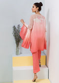 Perfect ombre dyed piece in shades of pink featuring straight cut shirt, organza and grip pleated sleeves. Embroidered and embellished composition at the front and back. Straight cut raw silk pants.