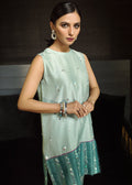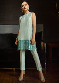 Bemberg Raw Silk thight length front & back embellished shirt. Ruffled hand work details at borders. Minimal details of pink in accents. Straight cut trouser with piping details