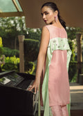Peach color two piece dress with Pistachio stripe. With pistachio 3D falling stripe. Embellishments all over the front. Box pleated pants in color block.