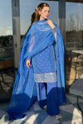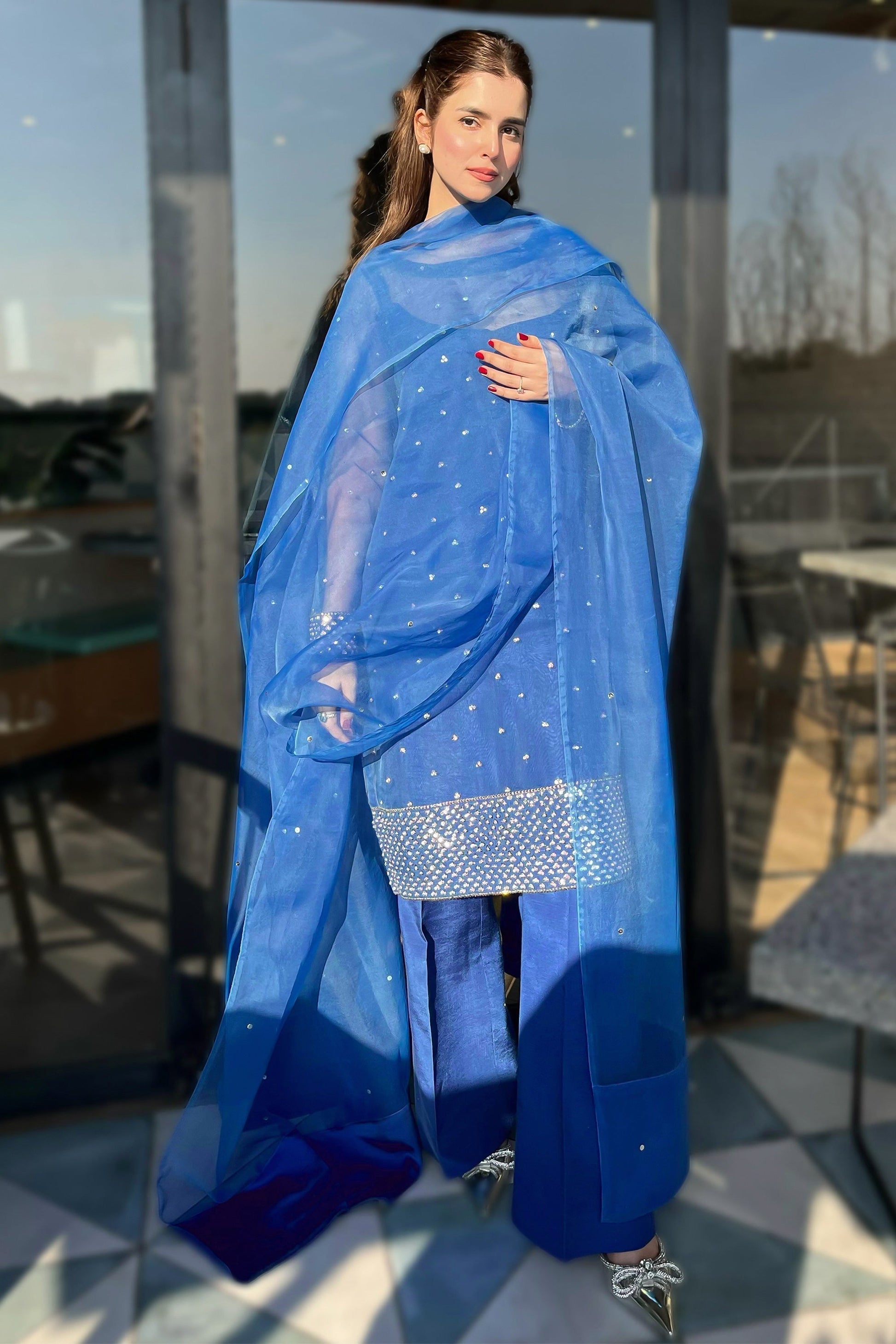 Azure in straight cut shirt with Tappered Trouser. Embellished with Sitaras on Organza fabric.