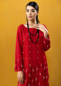 Go Rich, comes with a red raw silk heavily embellished shirt decorated with stones, crystals, sequins and pearls. Pair it with contrasting pants having red and black stripe details on the sides to have all eyes on you.