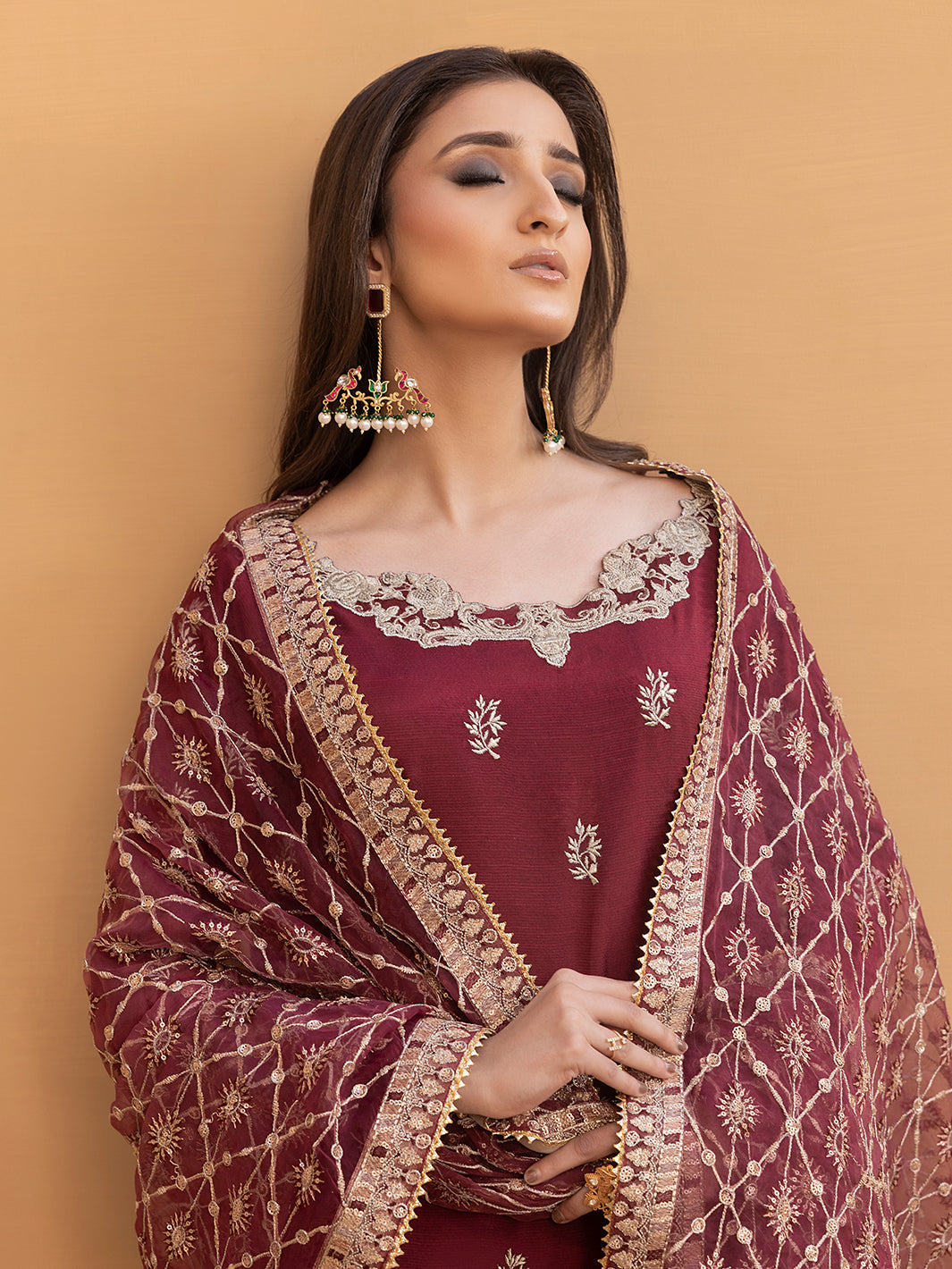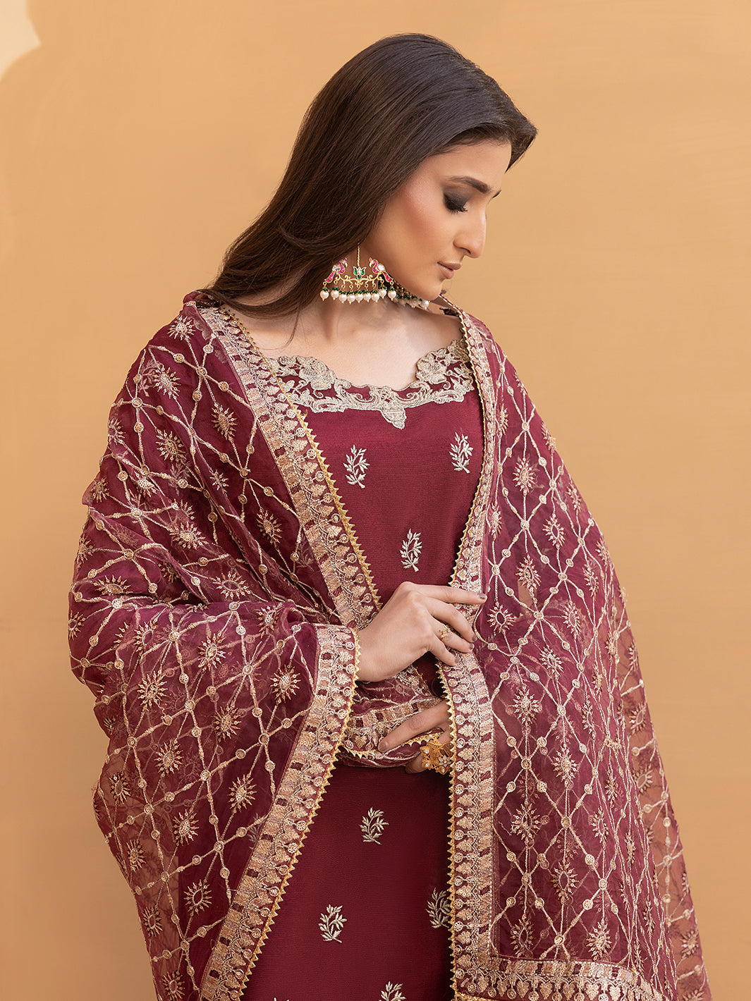 Maroon organza embroidered dupatta