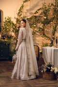 Off white flowy dress with matching flowy lehnga, adorned with subtle shimmer