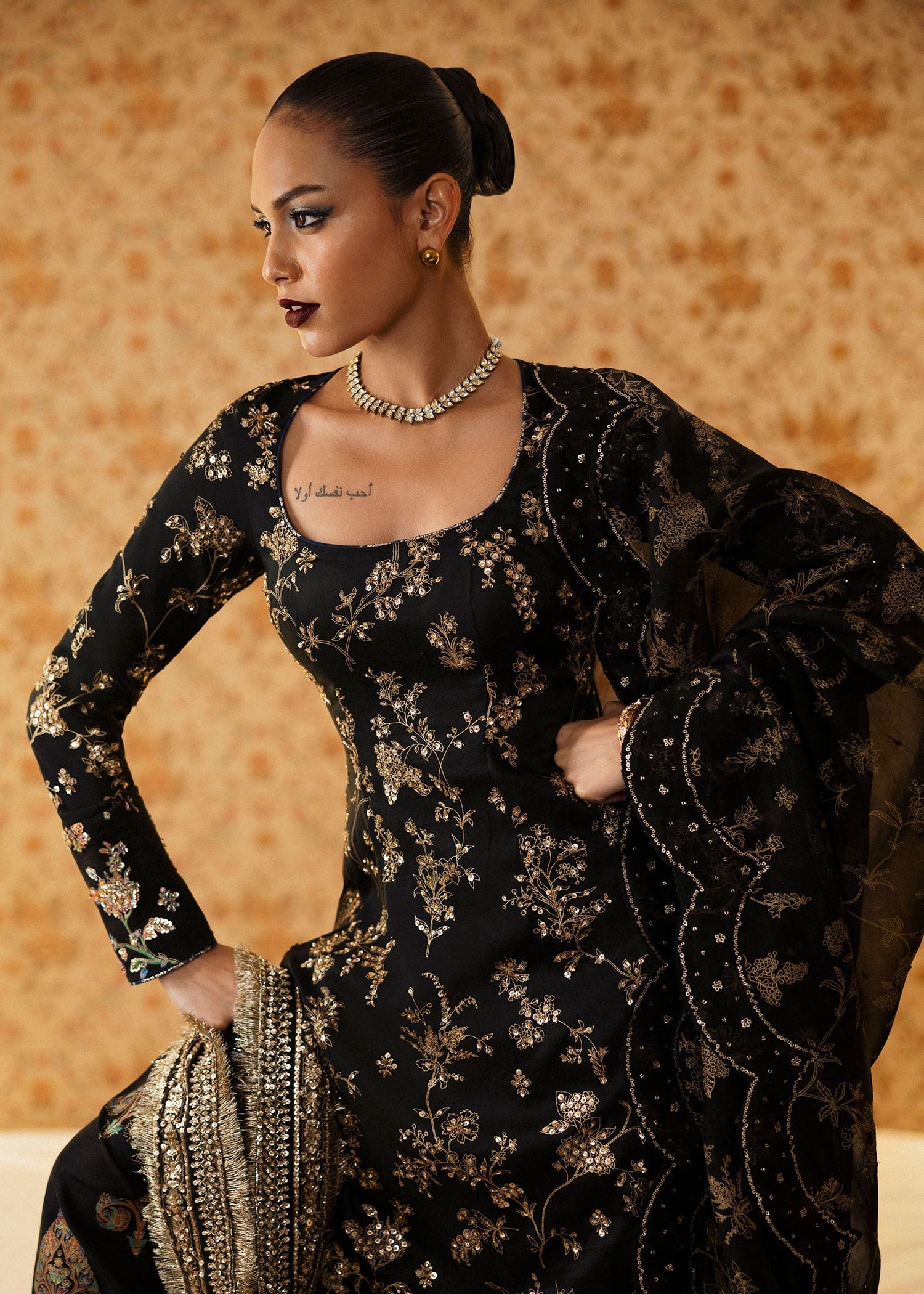 Make a stunning statement with this elegant black raw silk shirt, beautifully adorned with golden screen printing and intricate embellishments. Loop buttons on the cuffs enhance the refined aesthetic, making this piece truly eye-catching. Paired with a screen-printed black organza dupatta, this ensemble showcases a delicate multihead border that adds a touch of glamour. The embellished screen-printed shalwar perfectly complements the shirt, while the navy blue chanderi silk poncha with gotta lines introduces a unique and stylish contrast. This outfit is ideal for festive occasions, evening events, or any special celebration, combining traditional elegance with contemporary flair. Elevate your wardrobe with this striking ensemble that radiates sophistication and grace.