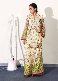A butter yellow silk coord set featuring a delicate floral print - spaced out across the front and more densely placed along the sleeves for visual contrast. The shirt is detailed with a button loop neckline and collar band, while parrot green composed borders line the sleeve hems with subtle slit detailing. Paired with relaxed, straight-fit pants in a matching print, finished with a parrot green border along the hem. A soft yet striking balance of color, composition, and ease.