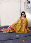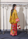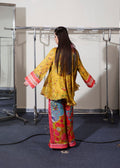 A mustard mid-thigh A-line silk shirt adorned with soft floral prints, accented by bold geometric printed borders at the sleeve hems. The neckline is finished with delicate fabric tassels, adding movement and charm. Paired with multicolored floral printed flared pants, detailed with striking pink borders along the hem and side seams - a vibrant blend of pattern, color, and fluid silhouette.