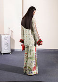 A light pistachio green silk coord set featuring a delicate floral repeat on the shirt, contrasted by a bolder floral print on the flared pants. Designed with green and red satin silk accents along the sleeve hems, neckline, and flared pantss side seams and hem for a striking finish. A printed collar and red satin tassel detail add dimension and charm - blending softness with vivid color play.