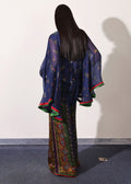 A midnight blue mid-thigh length floral printed silk shirt with red and green satin silk trims on full-circle sleeves and green satin tassel detailing on the neckline. Paired with multicolored floral printed wide-leg pants for a bold, effortless statement.