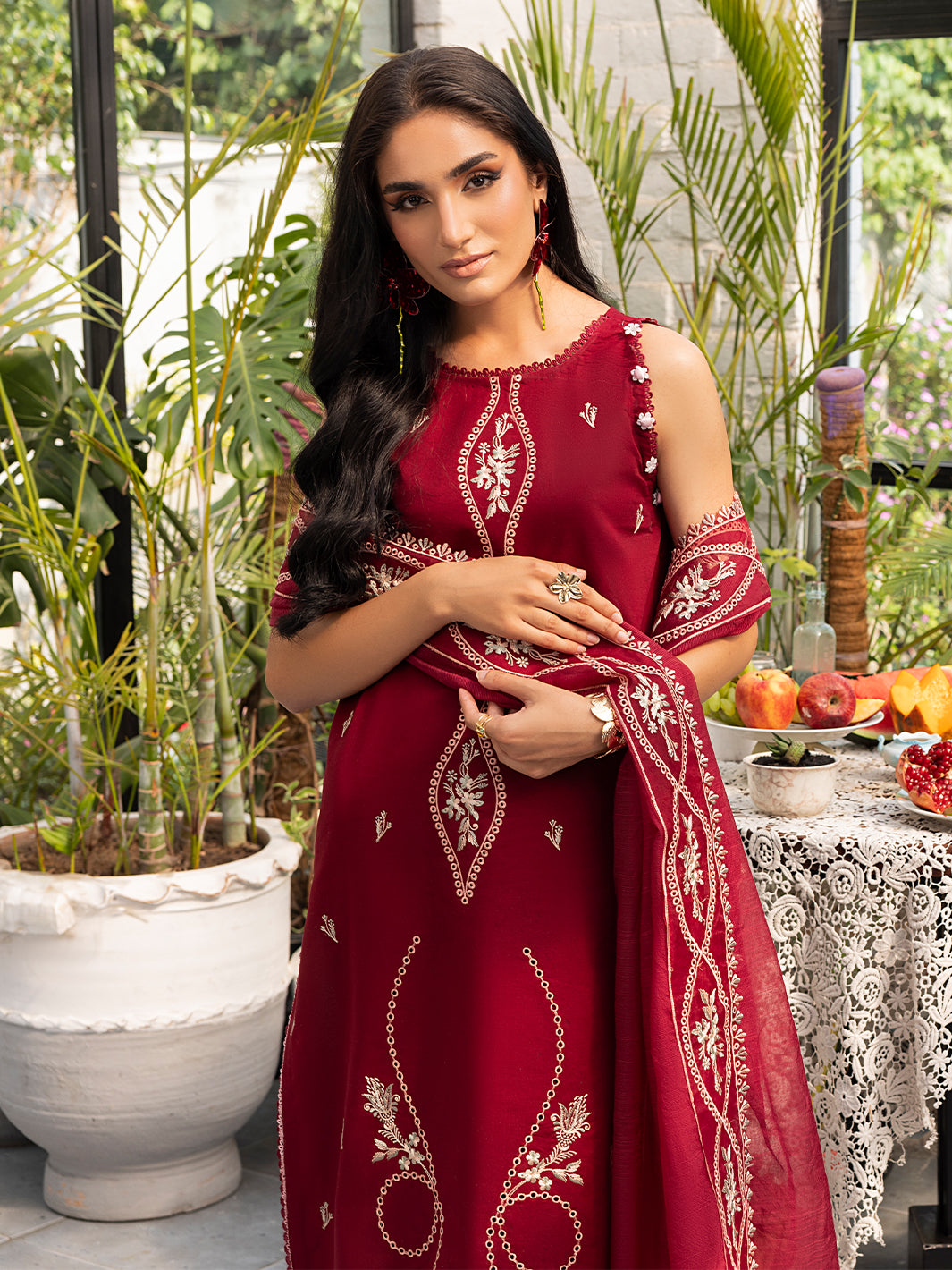 Elegant and effortlessly refined, Avara is designed in a rich berry hue - the kind that commands attention without saying a word. The embroidered lawn shirt is paired with a Monarch Slub dupatta, featuring tonal organza patchwork for added dimension. With organza sleeve detailing and a crisp cotton trouser, this 3-piece look transitions seamlessly from festive brunches to summer soirees.