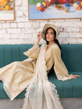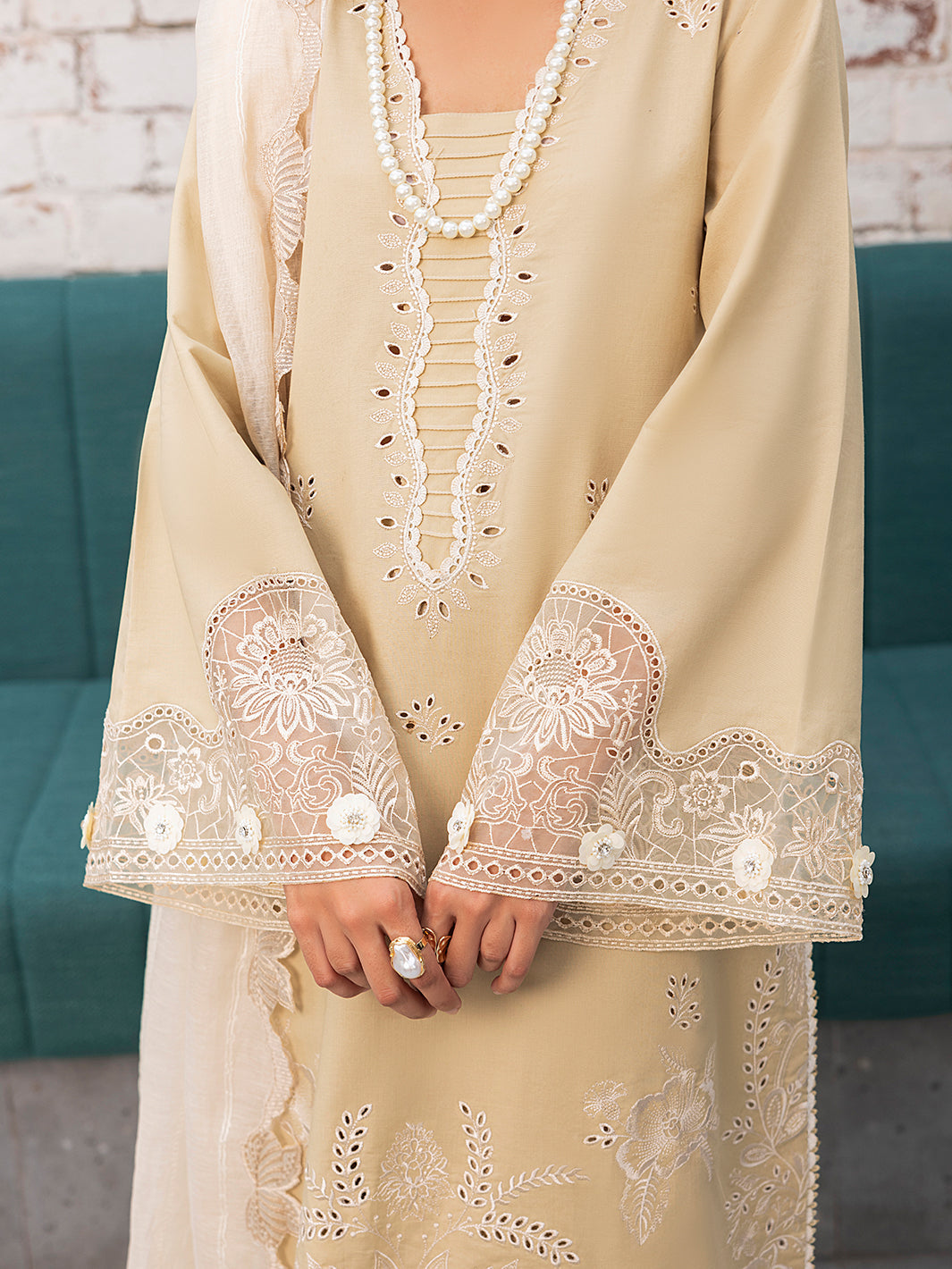 Liora is where elegance meets ease. Rendered in a soft, neutral hue, this 3-piece ensemble features an embroidered lawn shirt paired with delicate organza sleeve patches. The Monarch Taarkashi dupatta adds artisanal charm with embroidered organza pallu and side patches, completing the look with effortless sophistication. Finished with a plain dyed cotton trouser, Liora is the perfect choice for warm summer days and graceful gatherings.