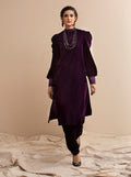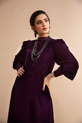 Mozart is a straight long deep purple velvet shirt featuring balloon detailing on the shoulder and satin cuffs. It is paired with loose shalwar to make it a perfect evening outfit.