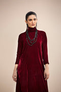 A playful pick for an evening out, this flowy trendy velvet outfit is a long dress featuring hi-neck and sleek sleeves. It captures the romance of the season.