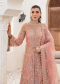 Eshaal is a vision of contemporary opulence, crafted from soft peach organza that exudes a refined, feminine grace. The gown is meticulously detailed with exquisite threadwork and subtle embellishments that shimmer with understated radiance, infusing the fabric with depth and dimension. Its sleek, front-open silhouette flows effortlessly, creating a fluid, figure-defining shape that moves with effortless elegance. The organza dupatta, adorned with delicate clusters of sequins, catches the light with an enchanting sparkle, while intricate embroidery enhances its luxurious texture, adding a layer of sophistication. The ensemble is complemented by printed flared trousers, their wide-leg silhouette offering a striking juxtaposition to the gownss delicate form, with the artistic print and gotta detailing at the hem elevating the overall design.