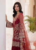 Zehrah, A name that embodies beauty, radiance, and celebration-captures the essence of festive elegance. This stunning ensemble reflects the spirit of sophistication and modernity, beginning with a rich red shirt, intricately embroidered with delicate embellishments and crystals that infuse the piece with a subtle yet captivating sparkle. The shirtss deep red hue symbolizes femininity and charm, making it a perfect choice for any special occasion where grace and style are paramount. Paired with the shirt are panel flared pants, their refined hemline border echoing the intricate design of the shirt, while the flared silhouette offers both comfort and dramatic flair, effortlessly combining contemporary flair with classic elegance. The printed dupatta, adorned with detailed embroidery and foil prints, enhances the look with a captivating tapestry of intricate patterns. Its four-sided embroidered border frames the dupatta with sophistication, bringing the entire ensemble together in a harmonious, timeless fusion of craftsmanship and modern fashion.