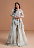 Radiate elegance in this refined moonlit silver peplum ensemble. The sleek tissue shirt features tailored sleeves and is lavishly adorned with intricate embroidery and delicate ada work, lending it a luxurious texture and subtle gleam. Paired with coordinating tissue pants enhanced by a soft gradient spray effect, the set strikes a perfect balance between modern glamour and timeless charm. A sheer, flowy organza dupatta completes the look, adding lightness and grace ideal for festive soirees and formal celebrations.
