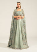 This captivating fresh ice blue ensemble features a shirt, embellished bustier, and lehenga. The shirt, crafted from aqua Kathan organza, is exquisitely hand-embellished with a dazzling mix of silver, lilac, and gold tones and boasts elegant, long drapey sleeves. It is paired with a stunning flared Jamavar lehenga, adorned with a graceful booti spray and heavy embellishments along the border, creating a look of opulent sophistication. This ensemble combines intricate detailing with rich textures, making it a perfect choice for any special occasion where you want to shine with elegance and style.