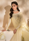A gorgeous lemon-colored long shirt adorned with silver and ivory embellishments around the neckline and along the panels, paired with straight pants and a flowy dupatta featuring exquisite lace detailing.