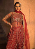 This stunning red long dress is a bold and glamorous statement piece, expertly crafted to exude both elegance and daring sophistication. Made from luxurious organza in a rich reddish-maroon hue, the dress cascades gracefully to the floor, creating a statuesque and regal silhouette. The form-fitting bodice enhances the curves while ensuring a flattering and comfortable fit. What truly sets this dress apart are the intricate embellishments-delicate embroidery, sequins, and exquisite details that add a radiant touch of sparkle and opulence. Paired with a matching sharara, this ensemble seamlessly combines classic design with contemporary refinement, making it the perfect choice for those seeking a look that is both timeless and captivating.