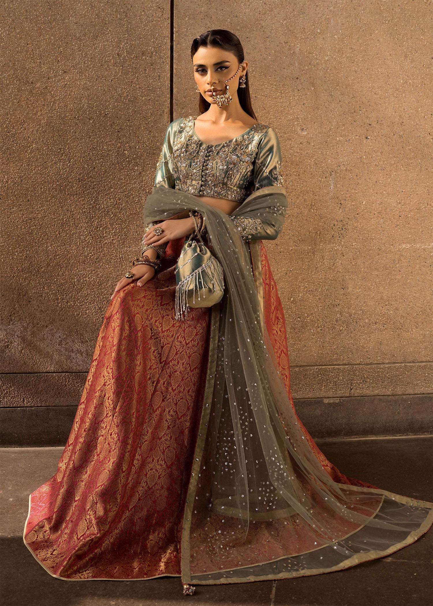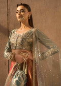 This dreamy pink lehenga paired with an ice-blue choli is a true work of art, richly embroidered with zardozi and resham accents. The intricate zardozi embroidery adds a luxurious touch, with its metallic sheen contrasting beautifully against the soft, delicate resham work. The lehenga exudes a refined elegance, while the ice-blue choli brings a cool, refreshing contrast. The ensemble is completed with a sequin net dupatta, which provides a sheer, ethereal look that catches the light with every movement, creating a stunning and graceful effect. This outfit is perfect for those seeking a combination of tradition and modern glamour.