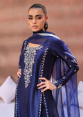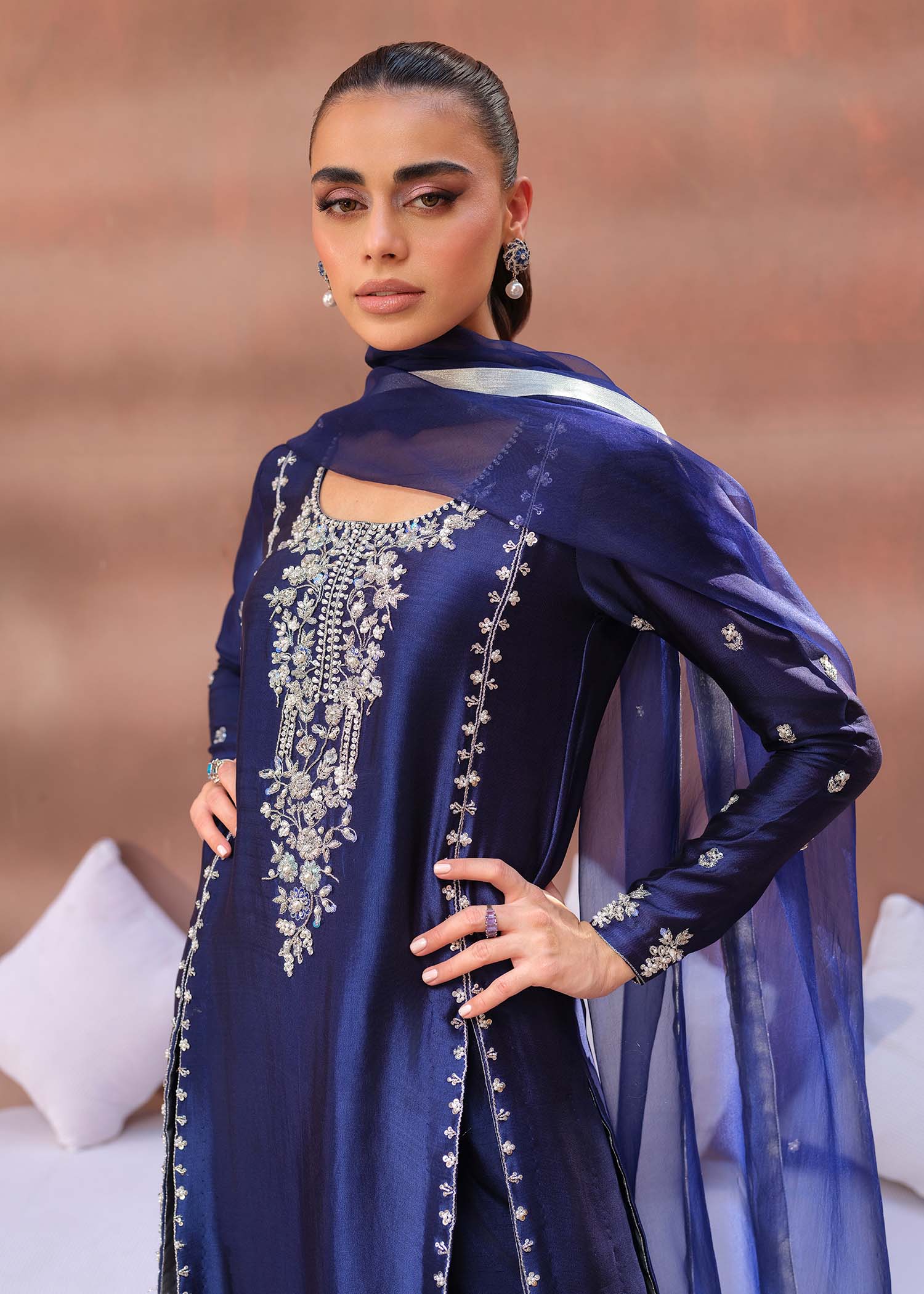 Get ready to be captivated by the irresistible allure of this enchanting ensemble, showcasing a mesmerizing midnight blue hue. Crafted to perfection from a blend of shiny tissue silk and organza, it emanates exquisite grandeur. The impeccably tailored shirt exudes timeless elegance, while the bootcut trousers add a touch of contemporary flair.